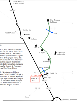 Seguir dirección Arbúcies, pasar la Cruz Roja y el cruce del Pitch &Putt hasta pasar el hito km 14 (pequeña indicación a la derecha de la carretera), enseguida tomar el camino a mano derecha que pone “Prohibit el pas camí particular”. A los 50mt pasar sobre un puente, a 250mt el camino se bifurca, seguir por el camino de mano derecha que sube teniendo una cerca al lado izquierdo. Seguir siempre con la cerca al lado, enseguida veran una casa blanca. Seguir recto con el muro de la casa a la izquierda al final de este hay una indicación que pone Can Riera a mano derecha