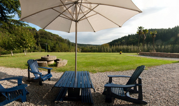 Can Riera compte amb un gran jardí de gespa en el que es poden diferenciar tres grans zones: